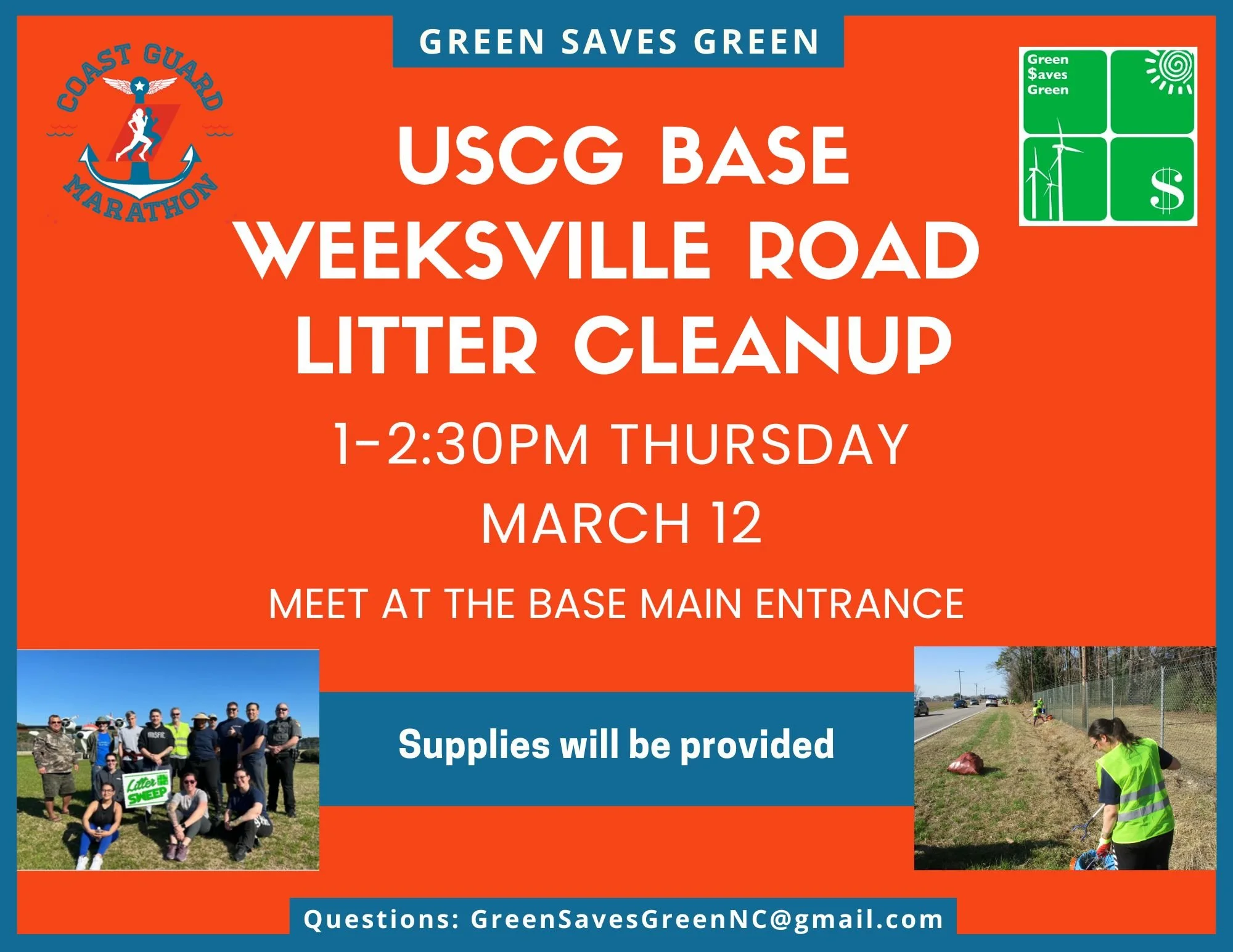 We’re getting a head start on our annual cleanup before the Coast Guard Marathon. Our plan is to pick up litter on a 1-mile stretch of Weeksville Road along the fence line of the Base. If we have enough volunteers, we will divide the group into two. Half will start at the base main entrance and work their way south, and the rest will start at the corner of Weeksville Road and Consolidated and work north.