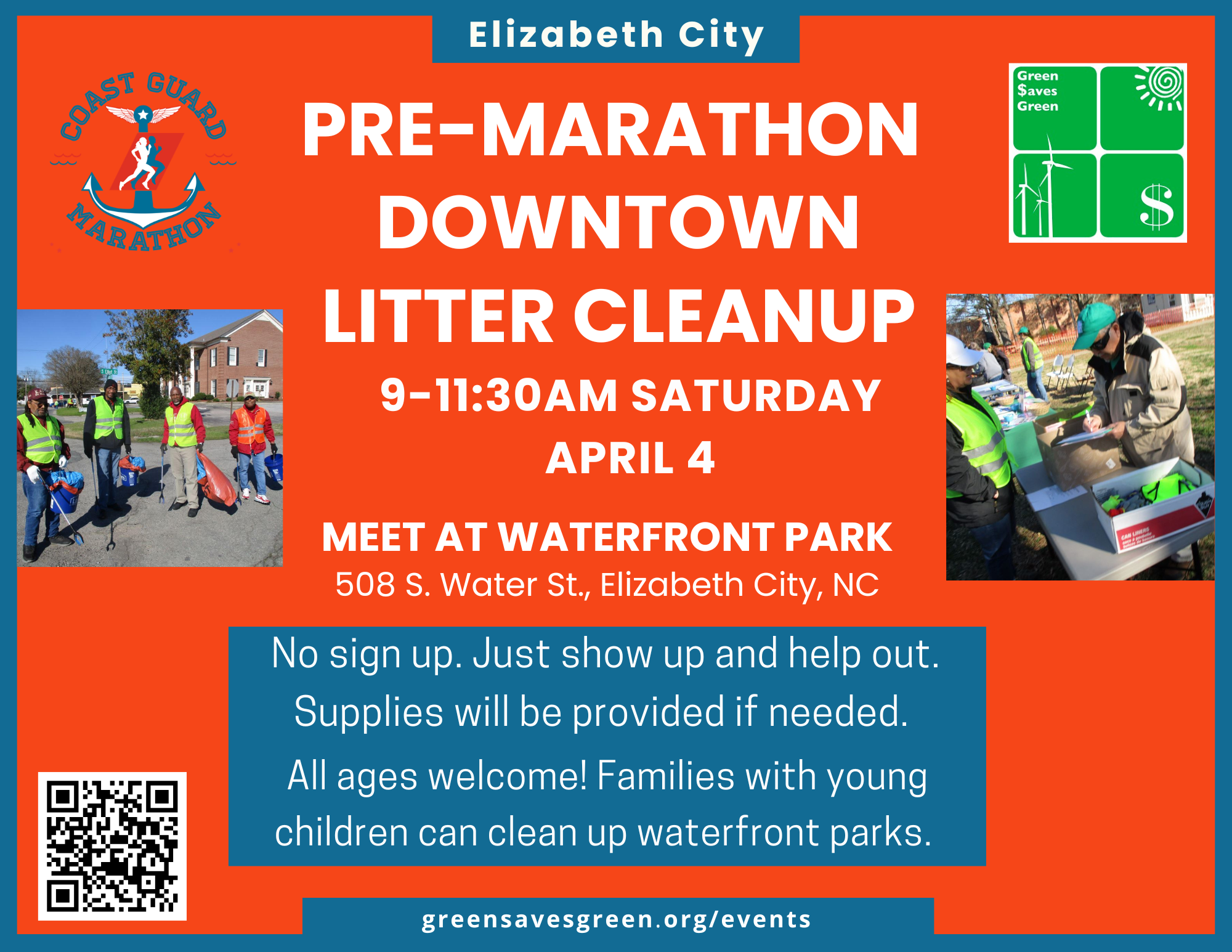 Help us get our city streets and downtown parks looking their best before thousands of runners and visitors arrive for the U.S. Coast Guard Marathon. The focus will be downtown Elizabeth City, but if there are enough volunteers we’ll send people to clean up other areas of the race route. All supplies will be provided to those who need them. Bring your own if you have them. No need to sign up. Just show up. We’ll meet at 9 a.m. at Waterfront Park in Elizabeth City.